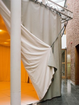 curtains for the scenography of "Victor Bourgeois - Le salut de l'architecture c'est la dèche", Halles Saint-Géry, Brussels, 2021, scenography CENTRAL, prod. ACP, image by Maxime Delvaux
